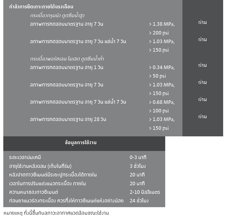 • ปูกระเบื้องได้ทั้ง กระเบื้องดูดซึมน้ำสูง กระเบื้องดูดซึมน้ำปานกลาง และกระเบื้องดูดซึมน้ำต่ำ ปูกระเบื้องพื้นและผนัง ทั้งภายในและภายนอกอาคาร